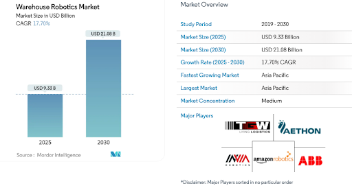 According to the latest market research, the warehouse robotics market size is projected to grow at a CAGR of 17.70% from 2025 to 2030.