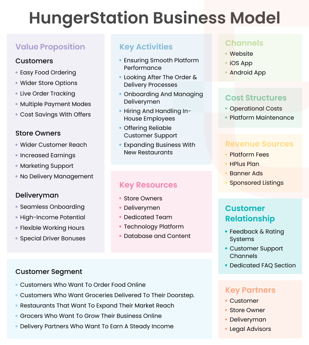 Let’s quickly look at the HungerStation business model canvas to understand its various business aspects.