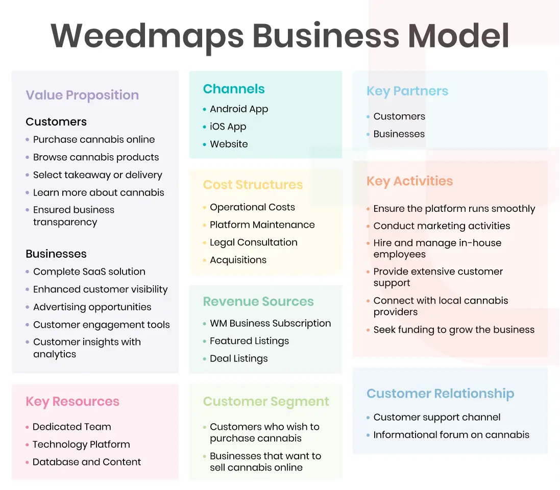 Below, we have broken down the Weedmaps business model into segments that help clarify who the company’s clients are, what benefits they receive, and what key activities the company undertakes to maintain its business.